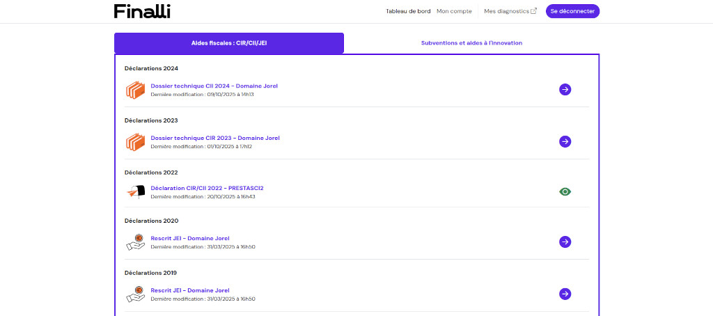 L’application est présentée comme une plateforme SaaS pour les aides fiscales à l’innovation (CIR/CII/JEI), permettant d’évaluer l’éligibilité d’une entreprise aux dispositifs de crédits d’impôts recherche (CIR), innovation (CII) ainsi qu’au statut de Jeune Entreprise Innovante (JEI), et de calculer les montants à déclarer auprès de l’administration.